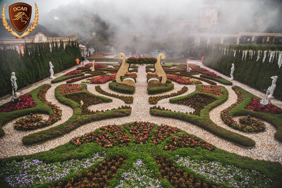 Le Jardin D’amour Flower Garden features nine enchanting gardens, each telling delightful stories through diverse architecture, all bursting with stunning flowers from around the globe.